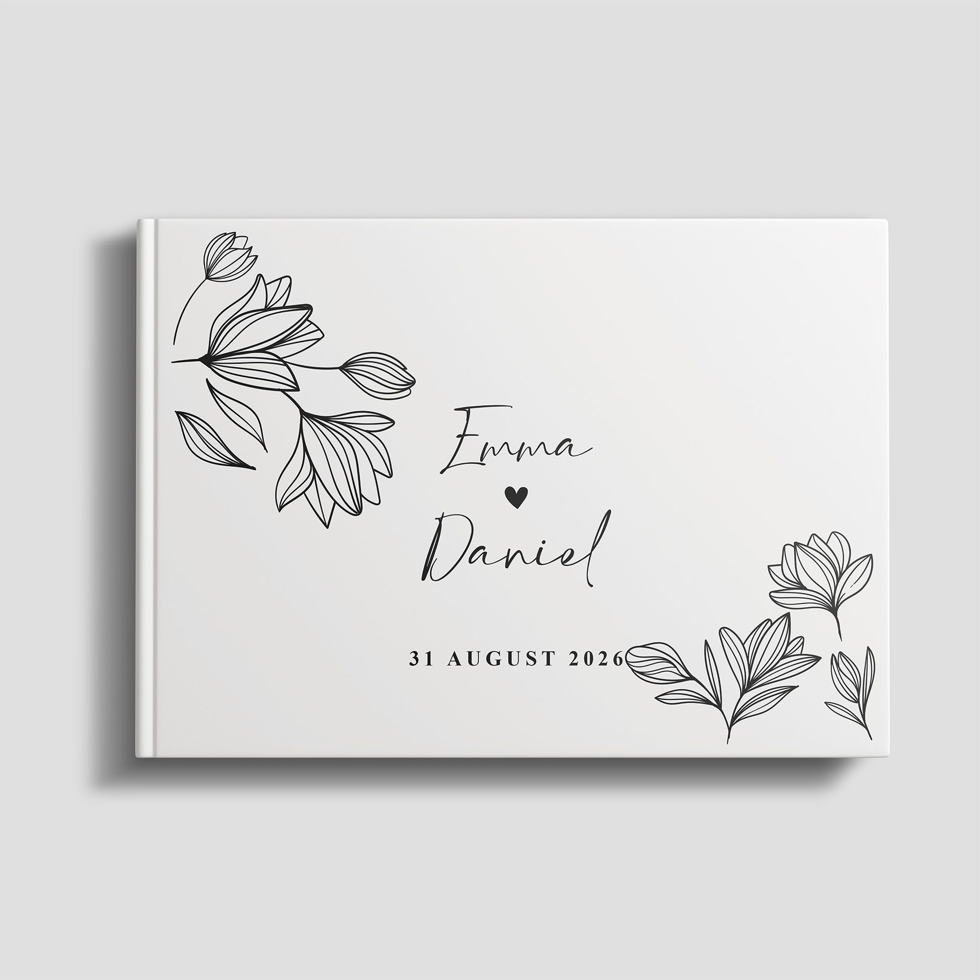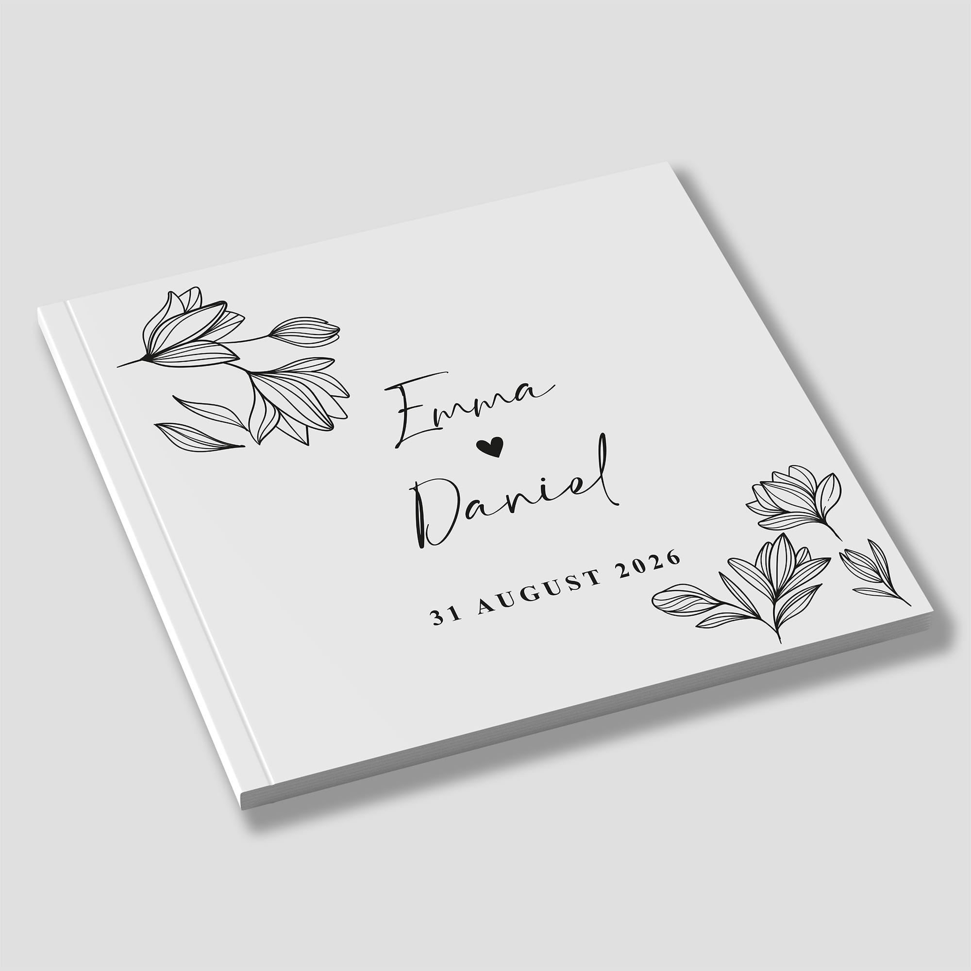 Der personalisierte Einband macht jedes Gästebuch zu einem Unikat – mit den Namen des Brautpaares, dem Hochzeitsdatum und einem ausgewählten Motiv, das zum Stil der Zeremonie passt.