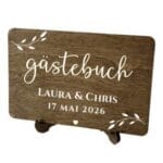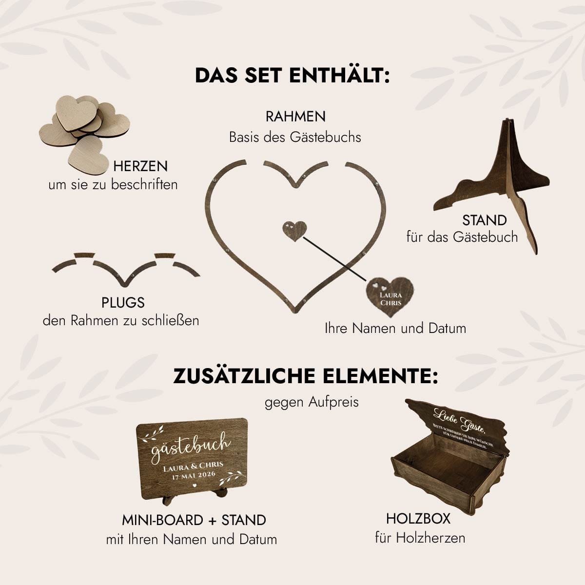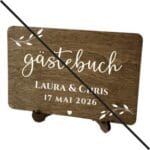 Die Gäste können ihre Wünsche auf die Herzen schreiben, wodurch ein reizvolles und interaktives Element entsteht, das Ihre Hochzeitsatmosphäre aufwertet.Personalisieren Sie Ihr Gästebuch alternativ mit Namen, Datum und einem besonderen Spruch, um es zu einem einzigartigen Andenken zu machen.