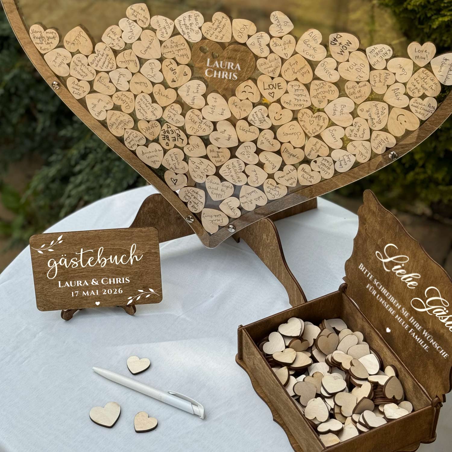 Dieses einzigartige Gästebuch Alternative aus hochwertigem Holz und Acrylglas ist in einer wunderschönen Herzform gestaltet und lädt Ihre Gäste ein, ihre Botschaften auf kleinen Holzherzen zu hinterlassen.