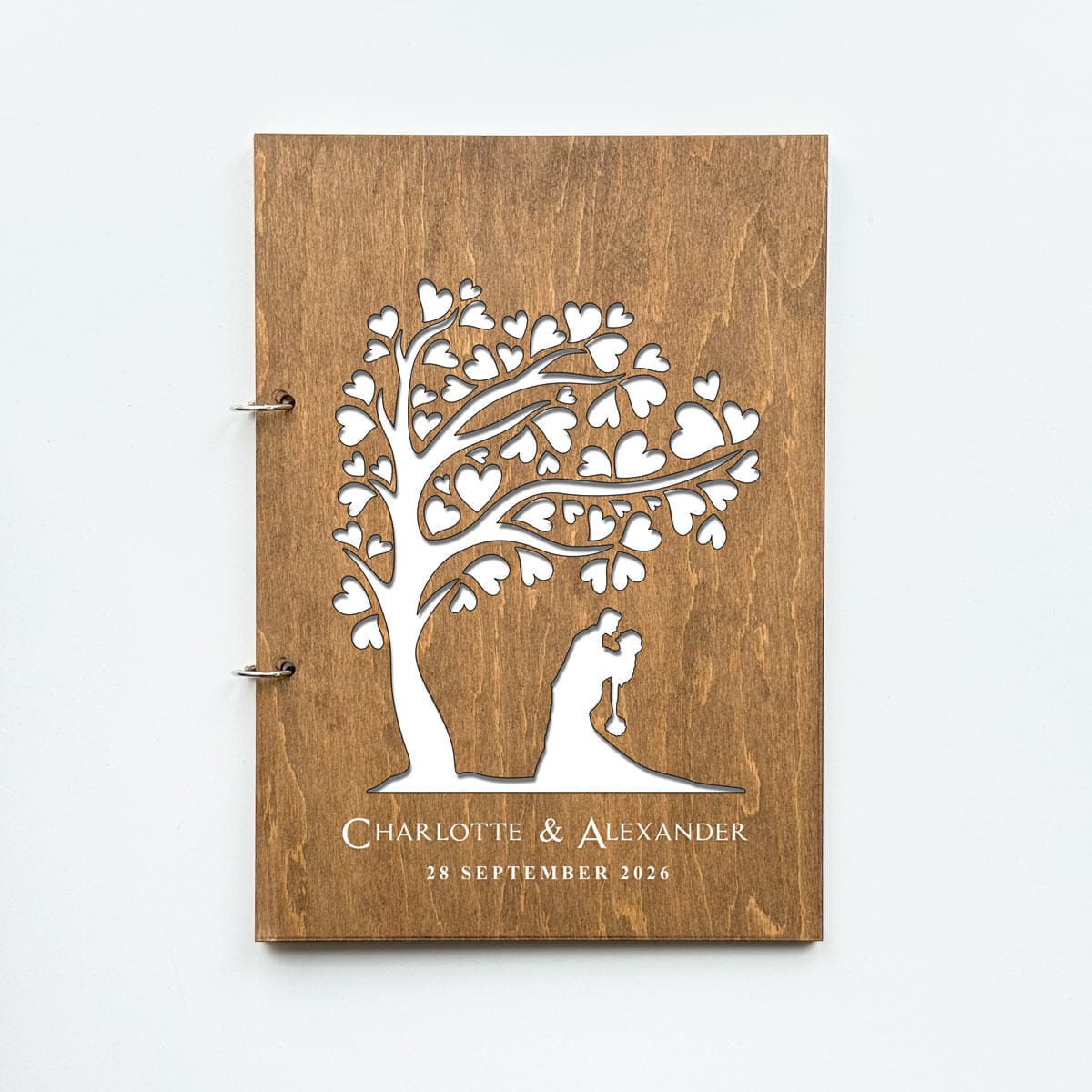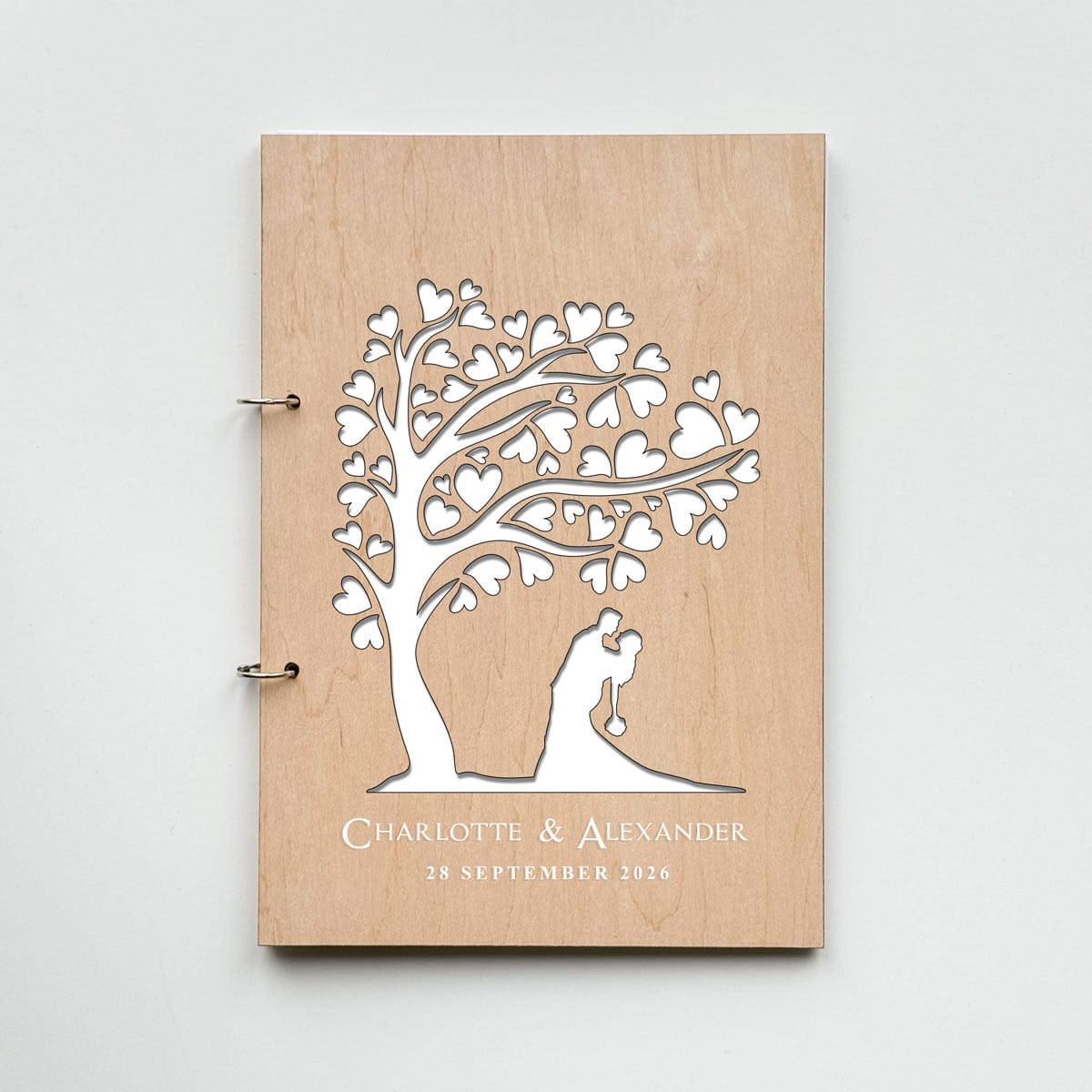 Elegante Gästebuch im A4–Format zeigt einen lasergeschnittenen Baum mit herzförmigen Blättern, die Liebe und Einheit symbolisieren.