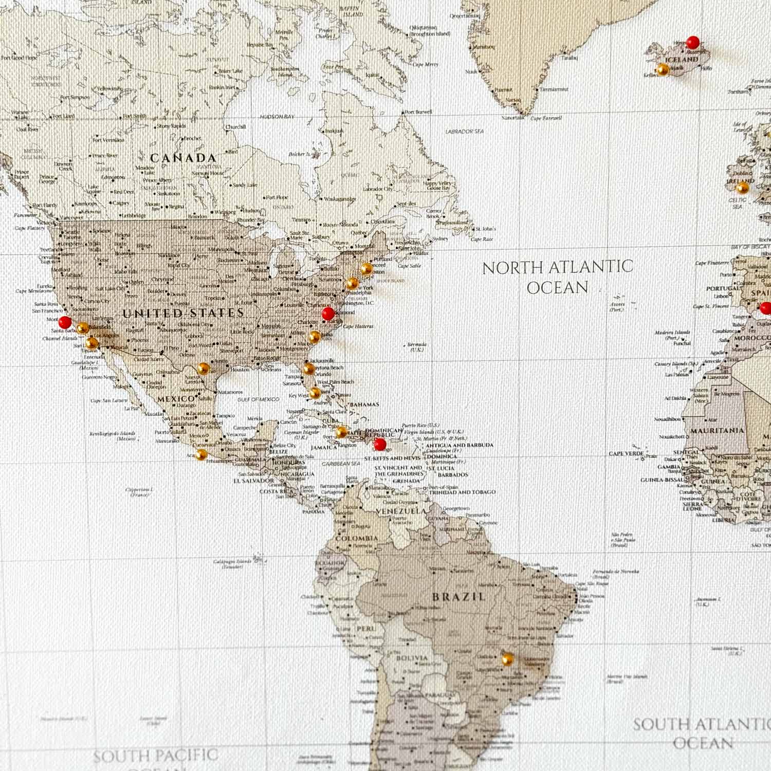 Jede Pinnwand Weltkarte wird mit 100 gratis Push-Pins geliefert – 50 in Gold-Metallic und 50 in Schwarz-Metallic – damit Sie sofort mit dem Markieren Ihrer Reisen beginnen können.