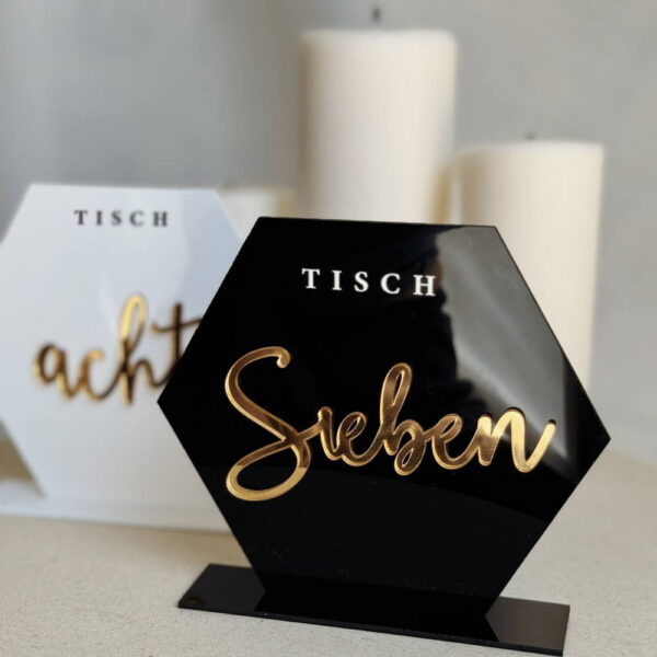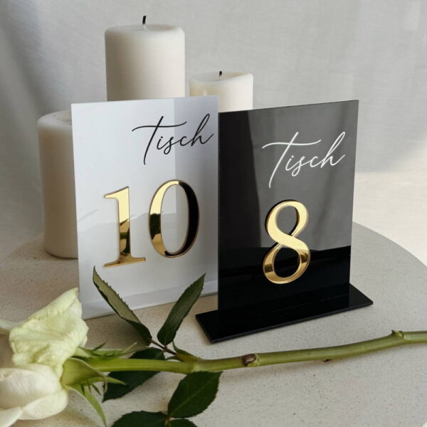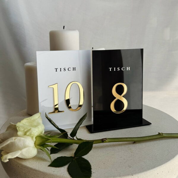 Tischnummern Hochzeit aus Acryl – die perfekte Hochzeitstischdekoration, die es Ihren Hochzeitsgästen leicht macht, den richtigen Tisch zu finden.