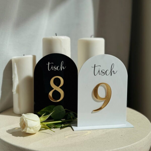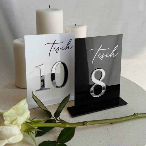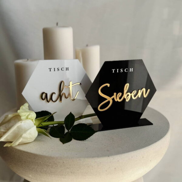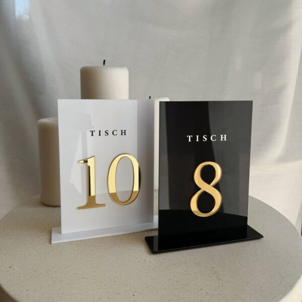 Tischnummern Hochzeit aus Acryl – die perfekte Hochzeitstischdekoration, die es Ihren Hochzeitsgästen leicht macht, den richtigen Tisch zu finden.