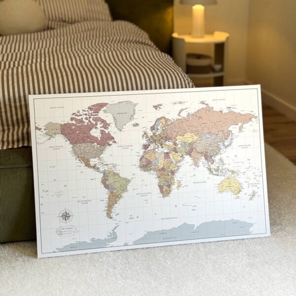 Auf einer hochwertigen Rückwand aus Schaumstoff und einem Holzrahmen montiert, ist es bereit zum Aufhängen und langlebig. So können Sie ganz einfach Fotos, Notizen, Erinnerungen oder Reisepläne anheften. Ganz gleich, ob Sie vergangene Reisen festhalten oder zukünftige Abenteuer planen, die Karte wird zu einer persönlichen Leinwand Ihrer Erlebnisse.
