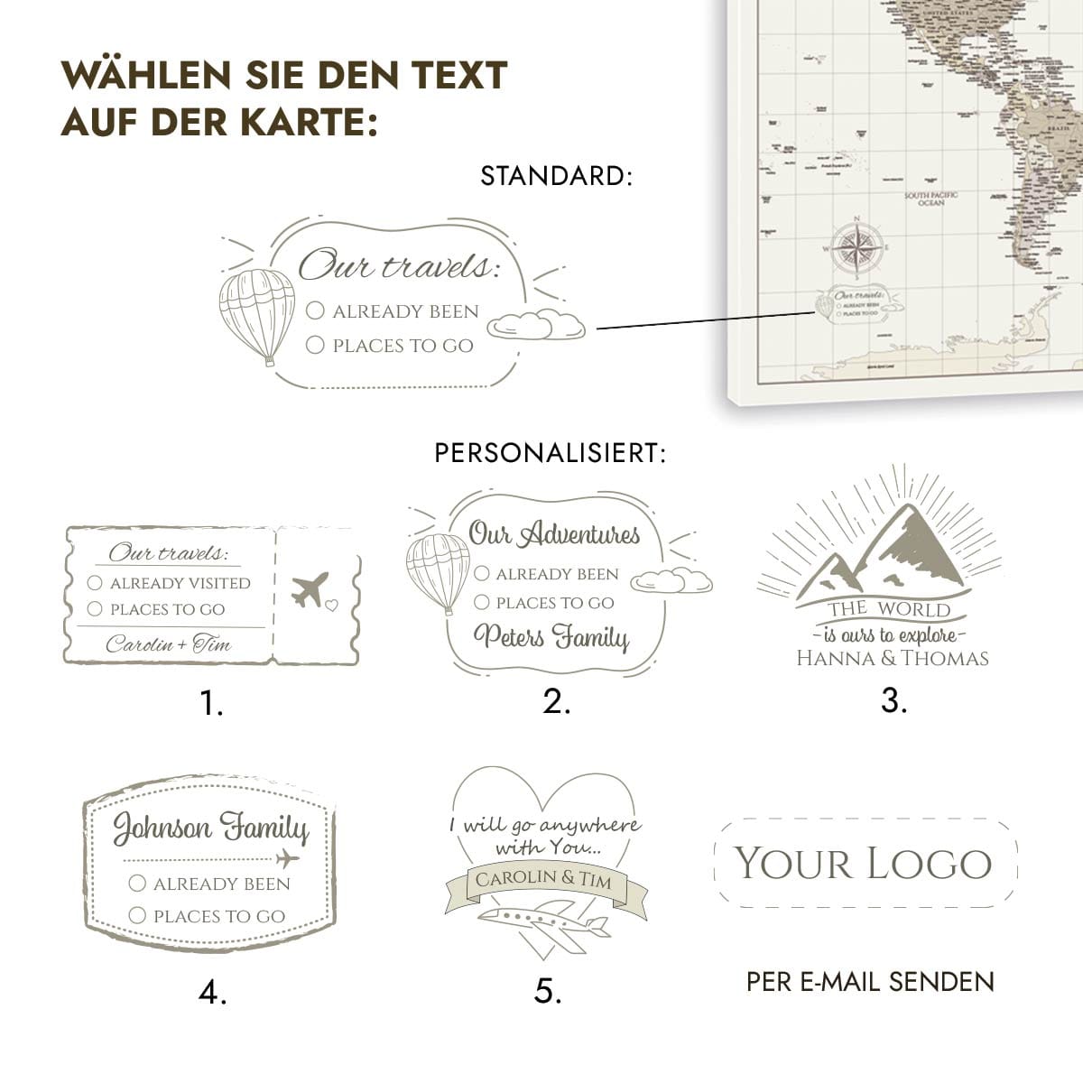 Personalisieren Sie die Weltkarte Pinnwand – fügen Sie Ihren eigenen Text oder Ihr Firmenlogo hinzu oder wählen Sie eine unserer 5 exklusiven Designvorlagen aus!