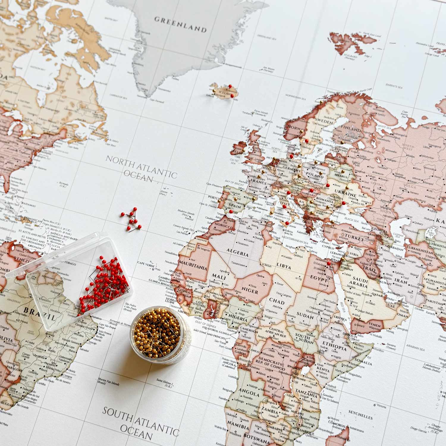 Verleihen Sie Ihrem Raum einen sanften, stilvollen Touch mit Weltkarte Pinnwand. Mit eleganten Pastelltönen und einem hochauflösenden UV-Druck auf strapazierfähigem Canvas ist diese Karte sowohl dekorativ als auch funktional. Verwenden Sie sie, um Fotos anzuheften, Abenteuer zu planen oder Ihre Reisen zu markieren.
